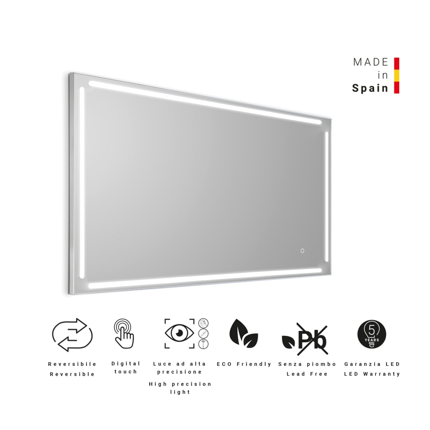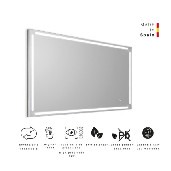Led-spiegel mit antibeschlag-system. produkt plus: digital touch, spiegel bleifrei, umweltfreundliches und umkehrbares glas. diese art von led ist perfekt für hochpräzise arbeiten wie make up und rasur. led: ip44, ii classe, rohs, class exempt group en 62471, 42w – 5700k – cri>91 – 220-240v – 50-60hz – 1140 lumen. antibeschlag-system: 22w. dieser spiegel wird in spanien hergestellt