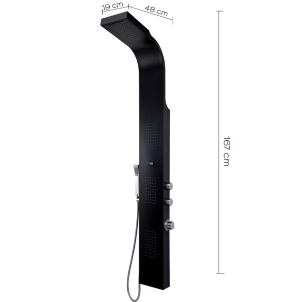 Multifunktions duschspaneel 167x19x48 cm, 1 duschkopf strahl, 1 wasserfall strahl, 3 massage strahlarten, handbrause 1 strahl, thermostatmischer, 2 x 2-wege- wasser on-off mischer-umsteller, doppelnaht-schlauch edelstahl 150 cm 1/2×1/2 mit verdrehschutz. plus produkt: das vorhandensein von mikrofonen, die einen nebel-effekt, universelle befestigung, antischfilter und eine wassereinsparung von 50% haben. düsen mit einfachem reinigungssystem. der flexible ist verdrehsicher, biegefest und temperaturbeständig bei 90°