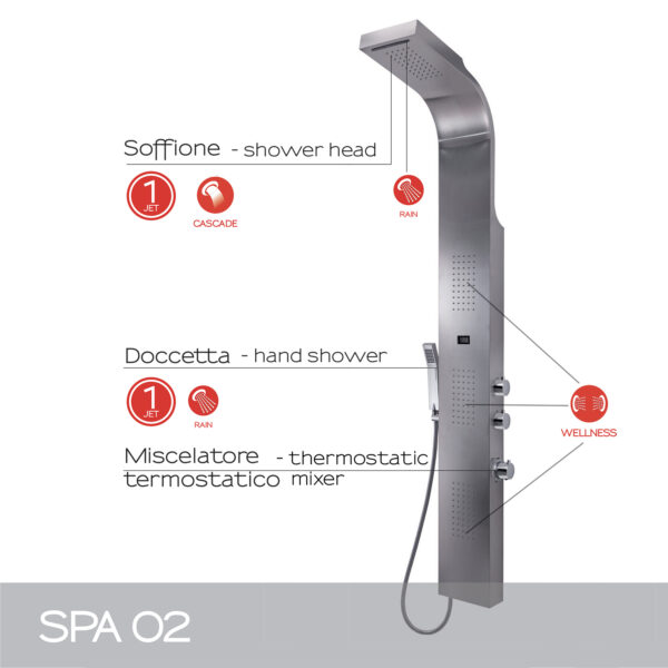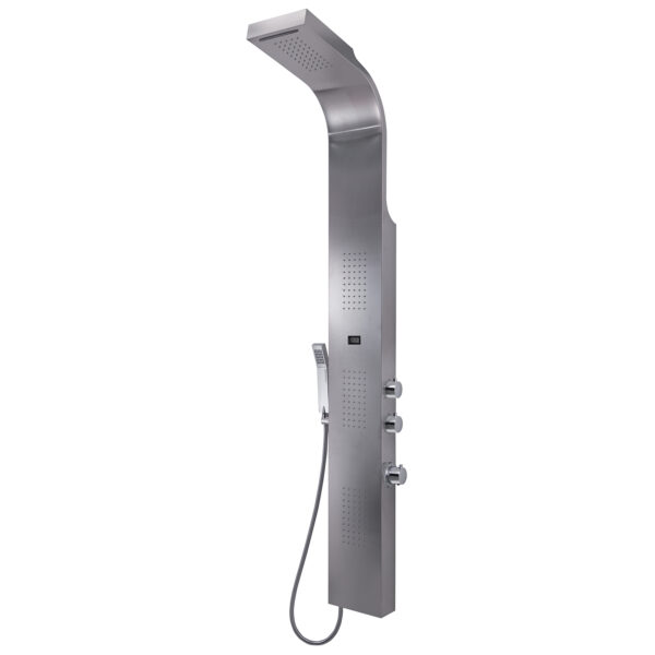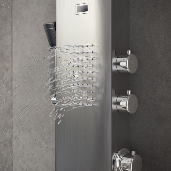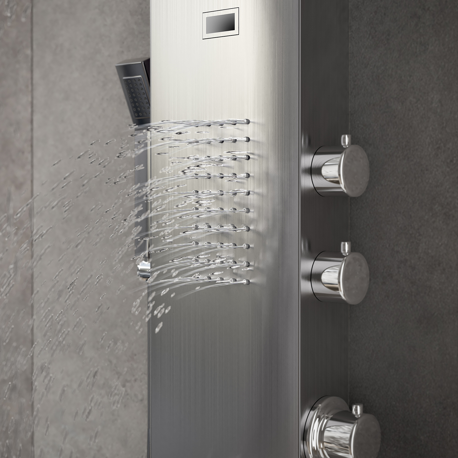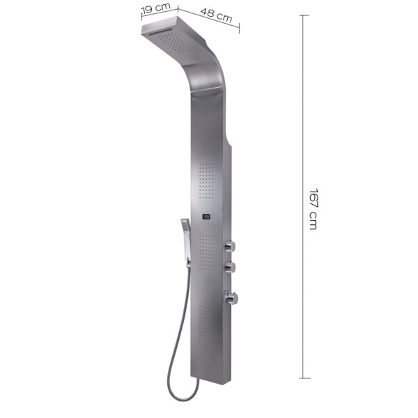Multifunktions duschspaneel 167x19x48 cm, 1 duschkopf strahl, 1 wasserfall strahl, 3 massage strahlarten, handbrause 1 strahl, thermostatmischer, 2 x 2-wege- wasser on-off mischer-umsteller, doppelnaht-schlauch edelstahl 150 cm 1/2×1/2 mit verdrehschutz. plus produkt: das vorhandensein von mikrofonen, die einen nebel-effekt, universelle befestigung, antischfilter und eine wassereinsparung von 50% haben. düsen mit einfachem reinigungssystem. der flexible ist verdrehsicher, biegefest und temperaturbeständig bei 90°