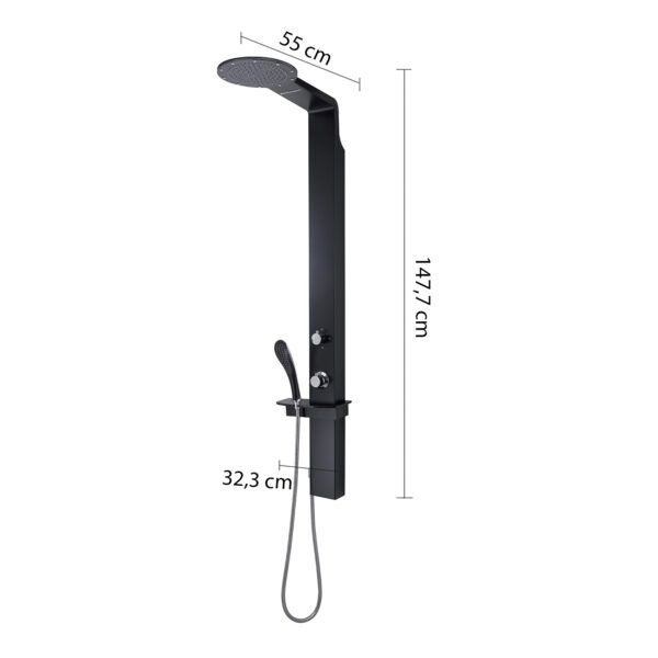 Multifunktions duschspaneel 145x11x55 cm, 1 duschkopf strahl, 1 wasserfall strahl, handbrause 1 strahl, thermostatmischer, 3-wege wasser umsteller, doppelnaht-schlauch edelstahl 150 cm 1/2×1/2 mit verdrehschutz. plus produkt: das vorhandensein von mikrofonen, die einen nebel-effekt, universelle befestigung, antischfilter und eine wassereinsparung von 50% haben. düsen mit einfachem reinigungssystem. der flexible ist verdrehsicher, biegefest und temperaturbeständig bei 90°