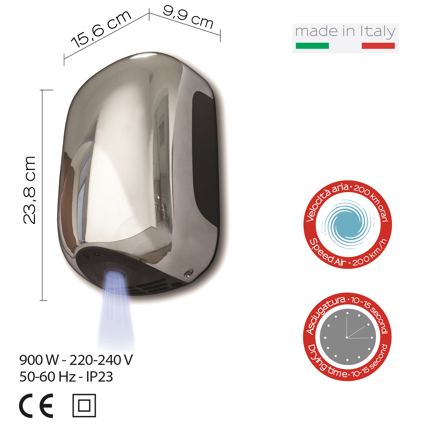 Eco-jet electric hand dryer with photocell 900w, energy saving product, air speed 410km/h drying 10/15 sec. classe ii – ip23 – 220-240 v 50-60hz