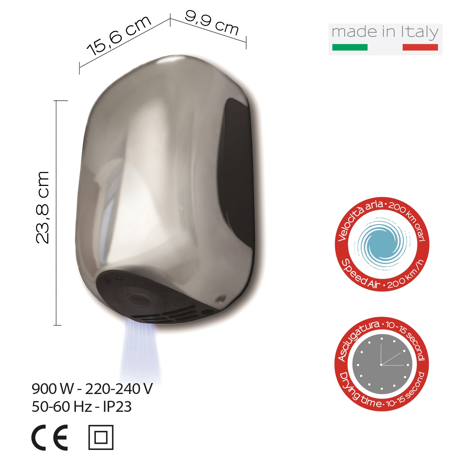 Eco-jet electric hand dryer with photocell 900w, energy saving product, air speed 410km/h drying 10/15 sec. classe ii – ip23 – 220-240 v 50-60hz