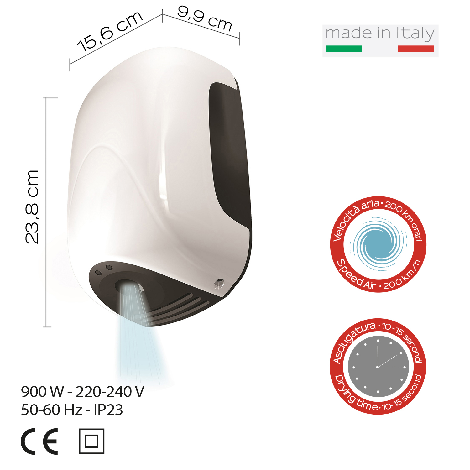 Eco-jet electric hand dryer with photocell 900w, energy saving product, air speed 410km/h drying 10/15 sec. classe ii – ip23 – 220-240 v 50-60hz