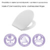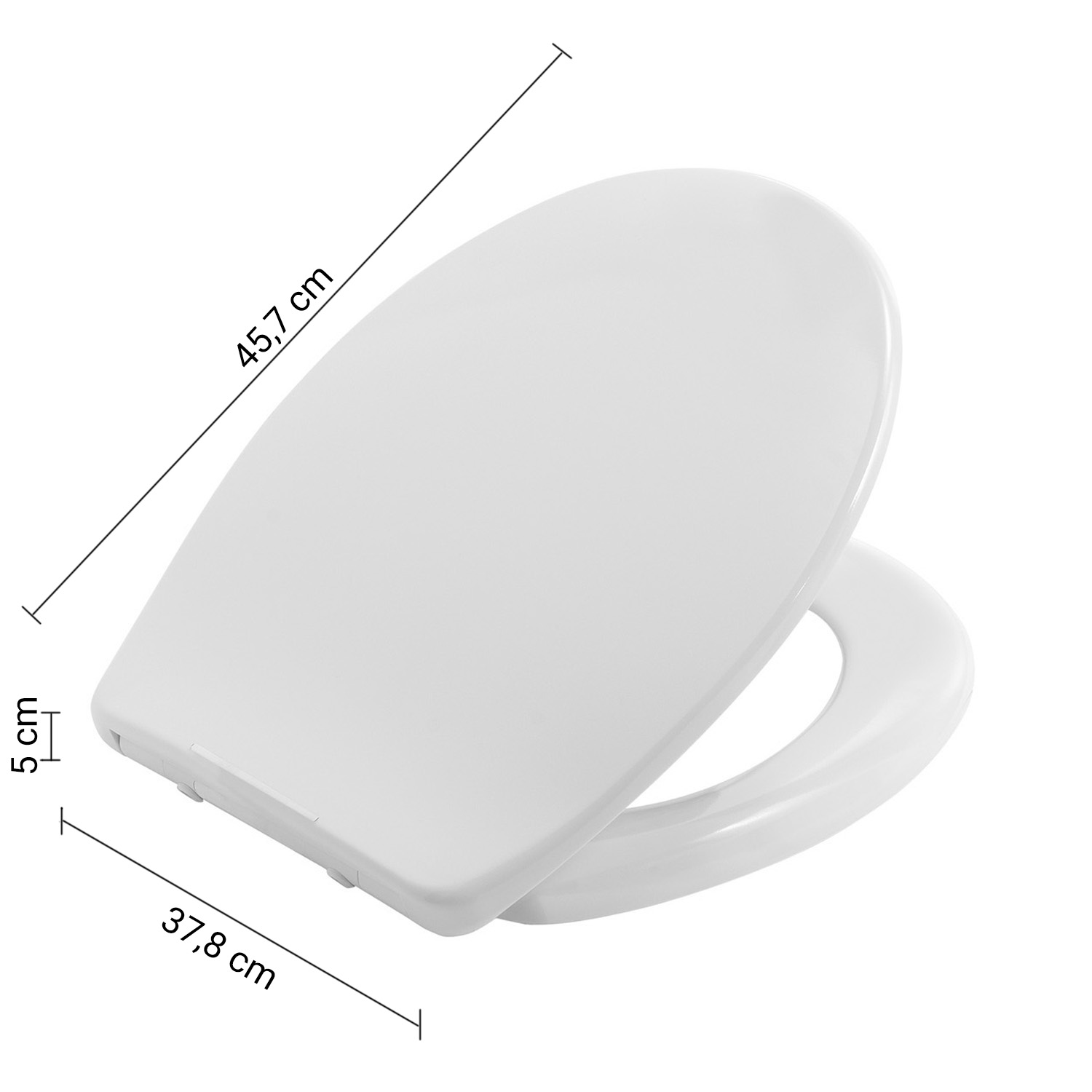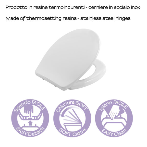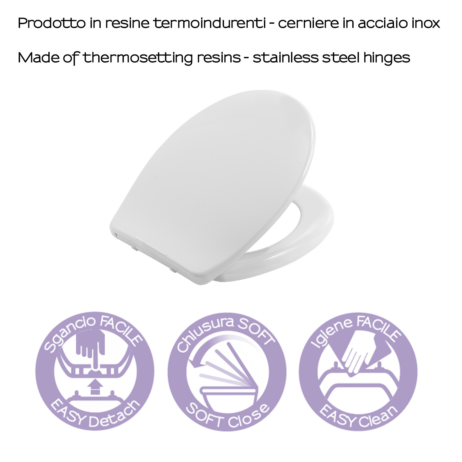 Toilet seat universal made of thermosetting resins with stainless steel hinges. plus product: easy detach, easy clean and closing soft close