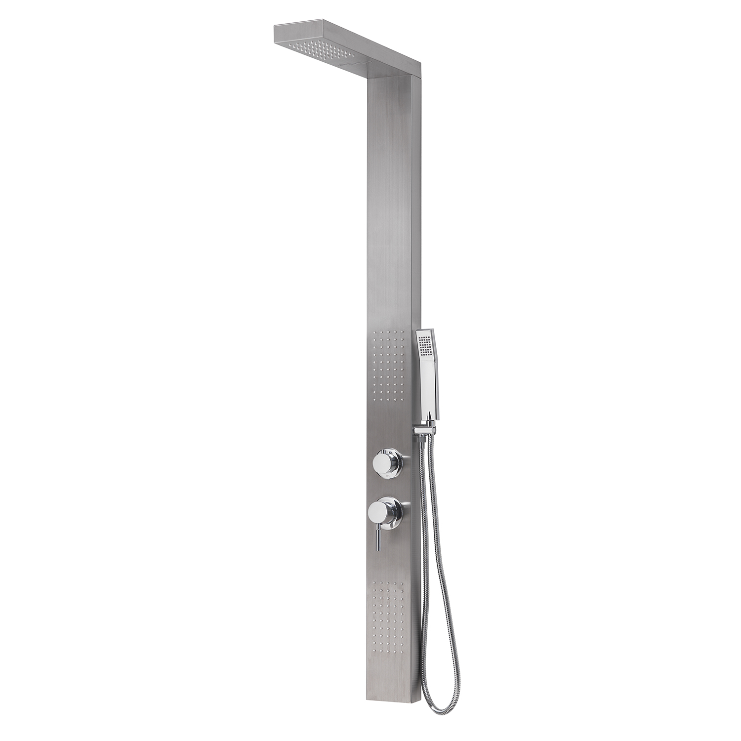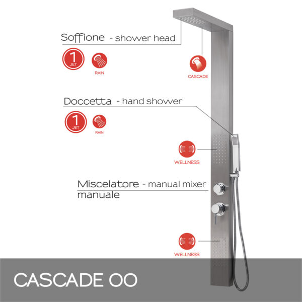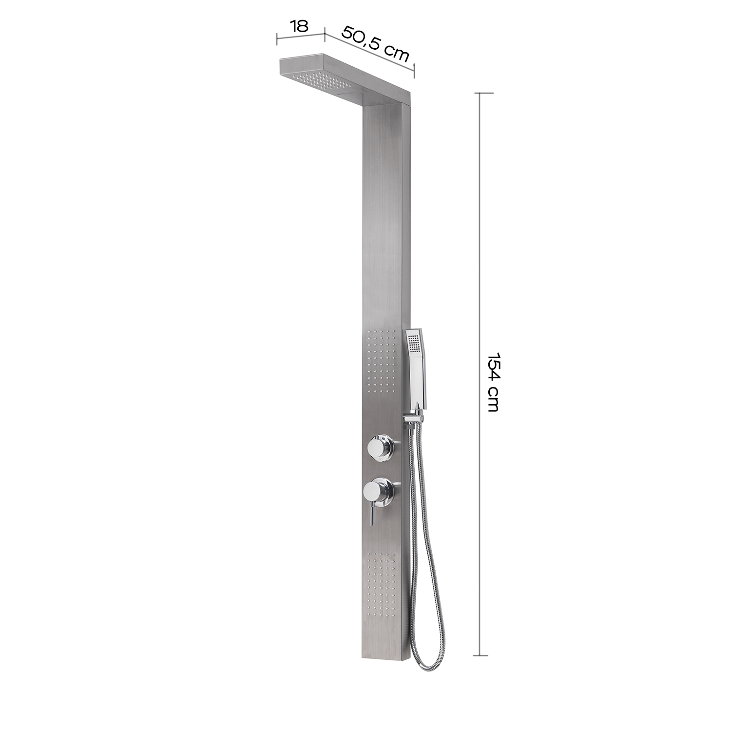 Multifunctions shower panel 155x12x50 cm, 1 shower head jet, 1 waterfall jet, 3 massage jets, 1 jet hand shower, manual mixer, 4 way water diverter, double lock in stainless steel flexible hose 150 cm 1/2×1/2 with conical anti-twist system. plus product: presence of micro-holes that creates a nebulous effect, universal connection, antisabbia filter and has a water saving reduction of 50%. nozzles with easy cleaning system. the hose is tear-resistant, resistant to bending and resistant to a temperature of 90°