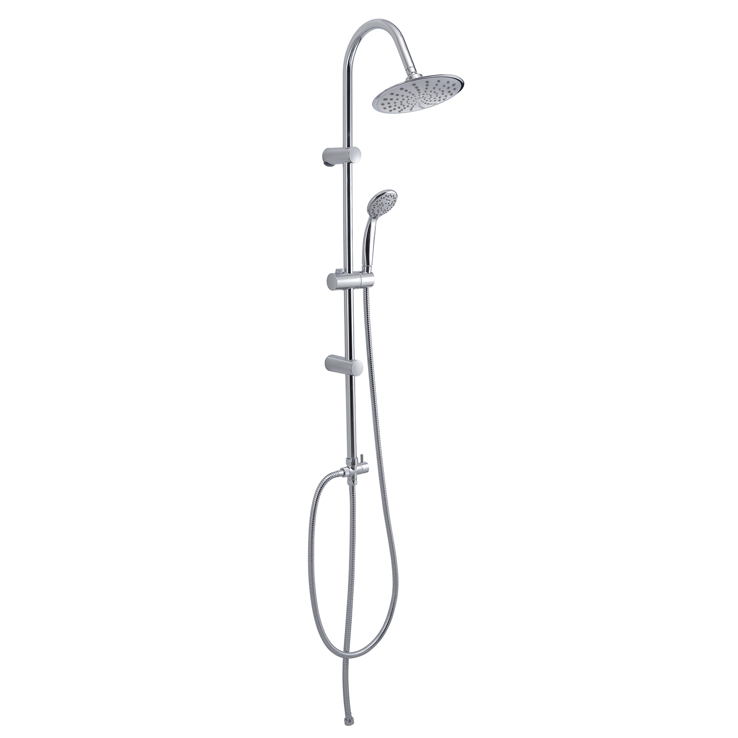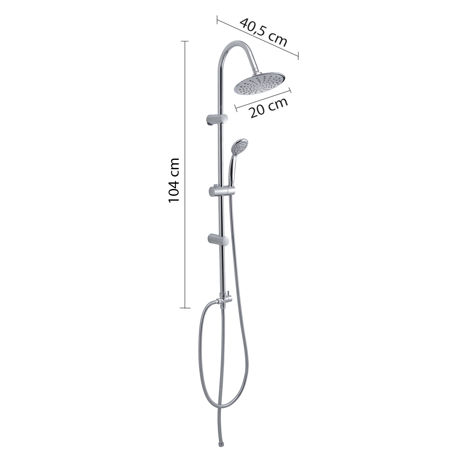 Adjustable shower column 104 cm, 1 jet shower head ø 20 cm, 4 jets hand shower, double lock in stainless steel flexible hose 150 cm 1/2×1/2 with conical anti-twist system, double lock in stainless steel flexible hose 60 cm 1/2×1/2, 2 way cartridge water diverter. plus product: presence of micro-holes that creates a nebulous effect, universal connection, antisabbia filter and has a water saving reduction of 50%. nozzles with easy cleaning system. the hose is tear-resistant, resistant to bending and resistant to a temperature of 90°