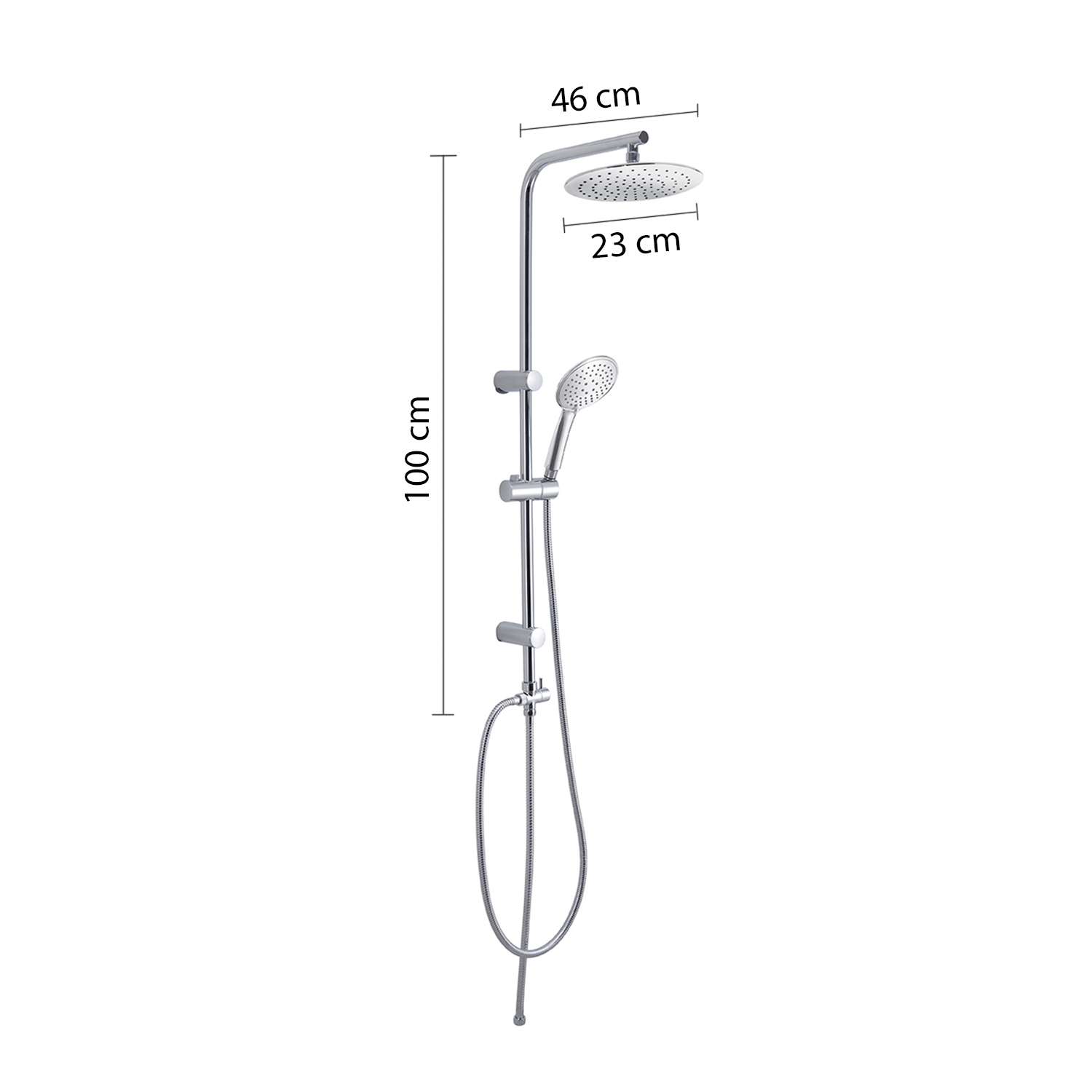Adjustable shower column 100 cm, 1 jet shower head ø 023 cm, 3 jets hand shower, double lock in stainless steel flexible hose 150 cm 1/2×1/2 with conical anti-twist system, double lock in stainless steel flexible hose 60 cm 1/2×1/2, 2 way cartridge water diverter. plus product: presence of micro-holes that creates a nebulous effect, universal connection, antisabbia filter and has a water saving reduction of 50%. nozzles with easy cleaning system. the hose is tear-resistant, resistant to bending and resistant to a temperature of 90°