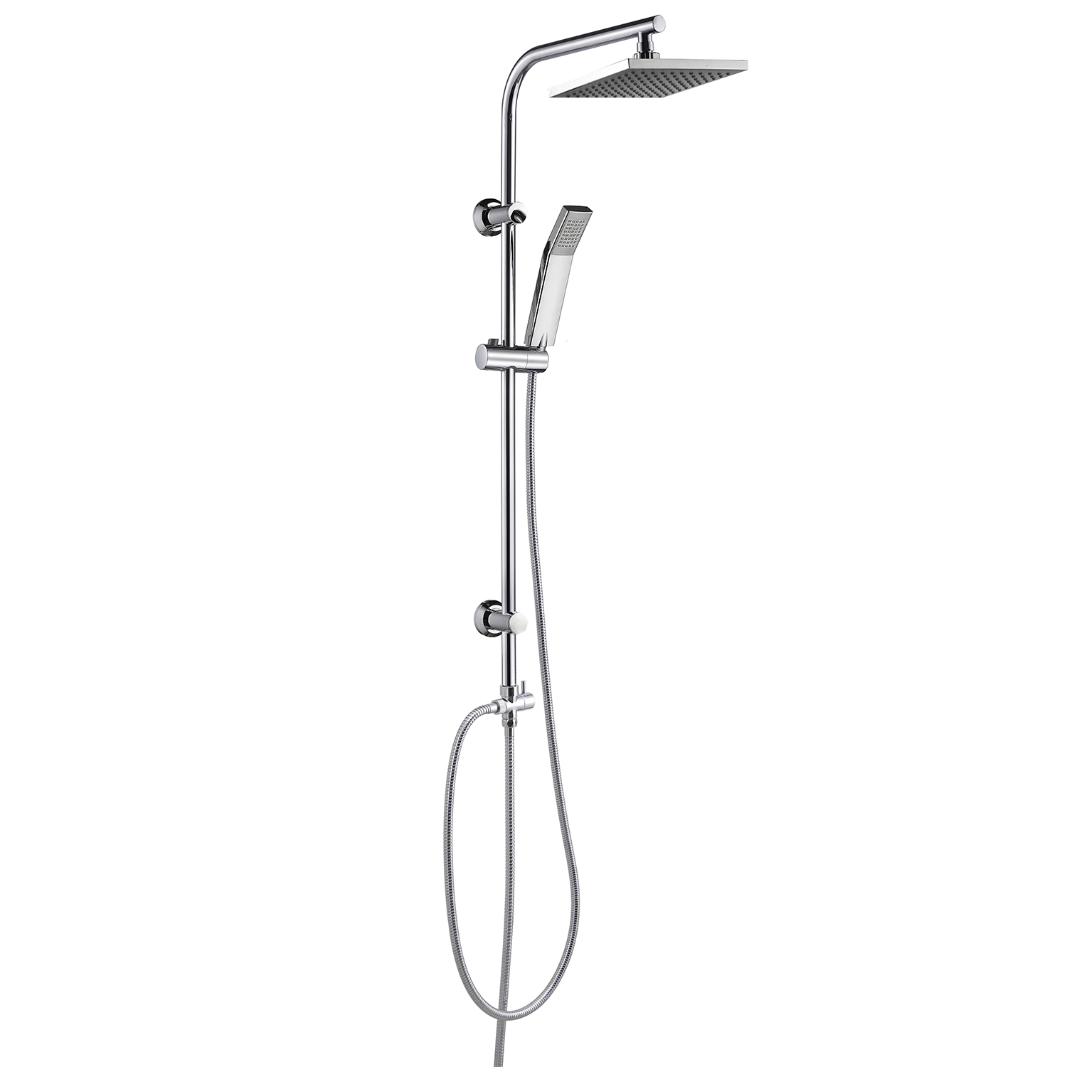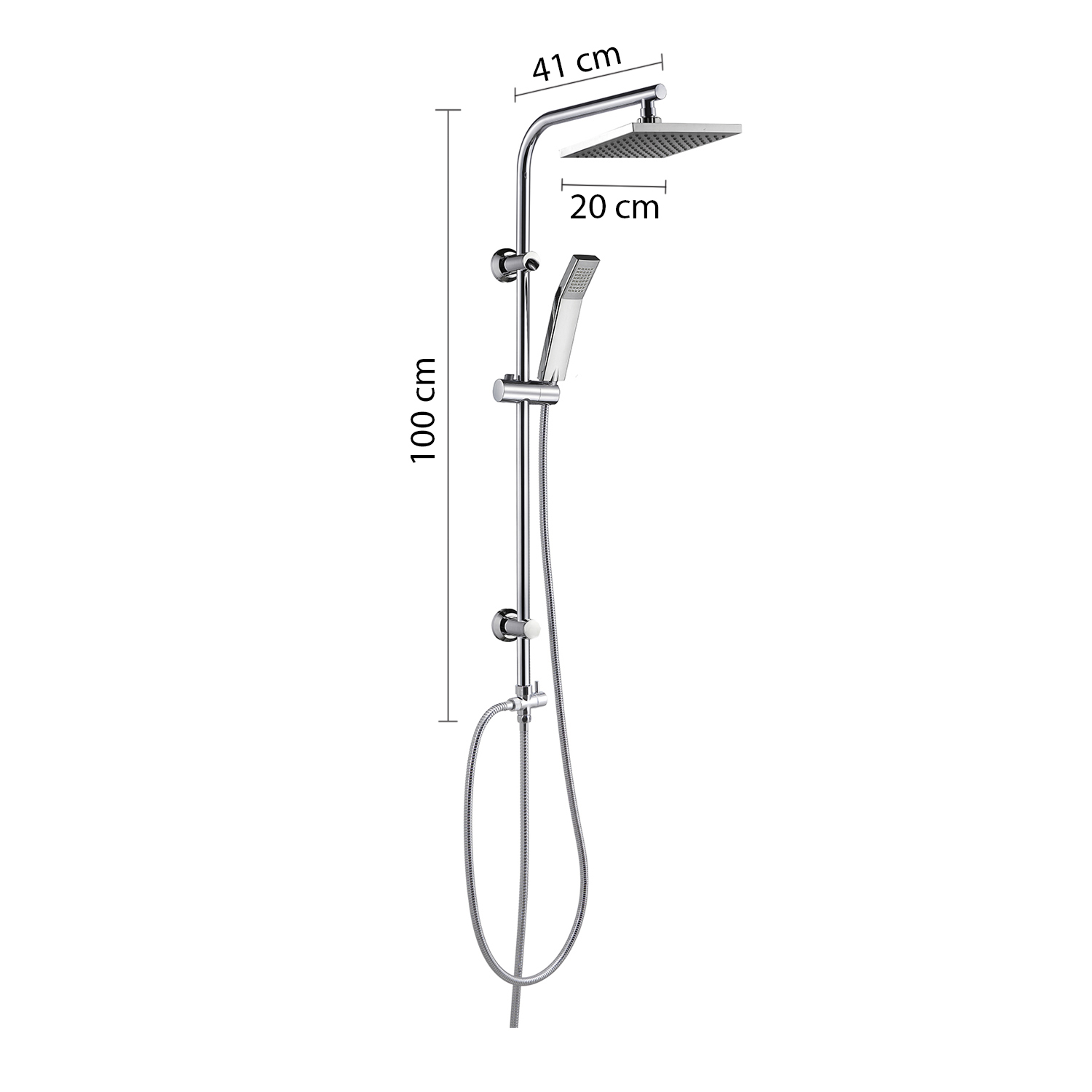 Adjustable shower column 100 cm, 1 jet shower head 20×20 cm, 1 jet hand shower, double lock in stainless steel flexible hose 150 cm 1/2×1/2 with conical anti-twist system, double lock in stainless steel flexible hose 60 cm 1/2×1/2, 2 way cartridge water diverter. plus product: presence of micro-holes that creates a nebulous effect, universal connection, antisabbia filter and has a water saving reduction of 50%. nozzles with easy cleaning system. the hose is tear-resistant, resistant to bending and resistant to a temperature of 90°