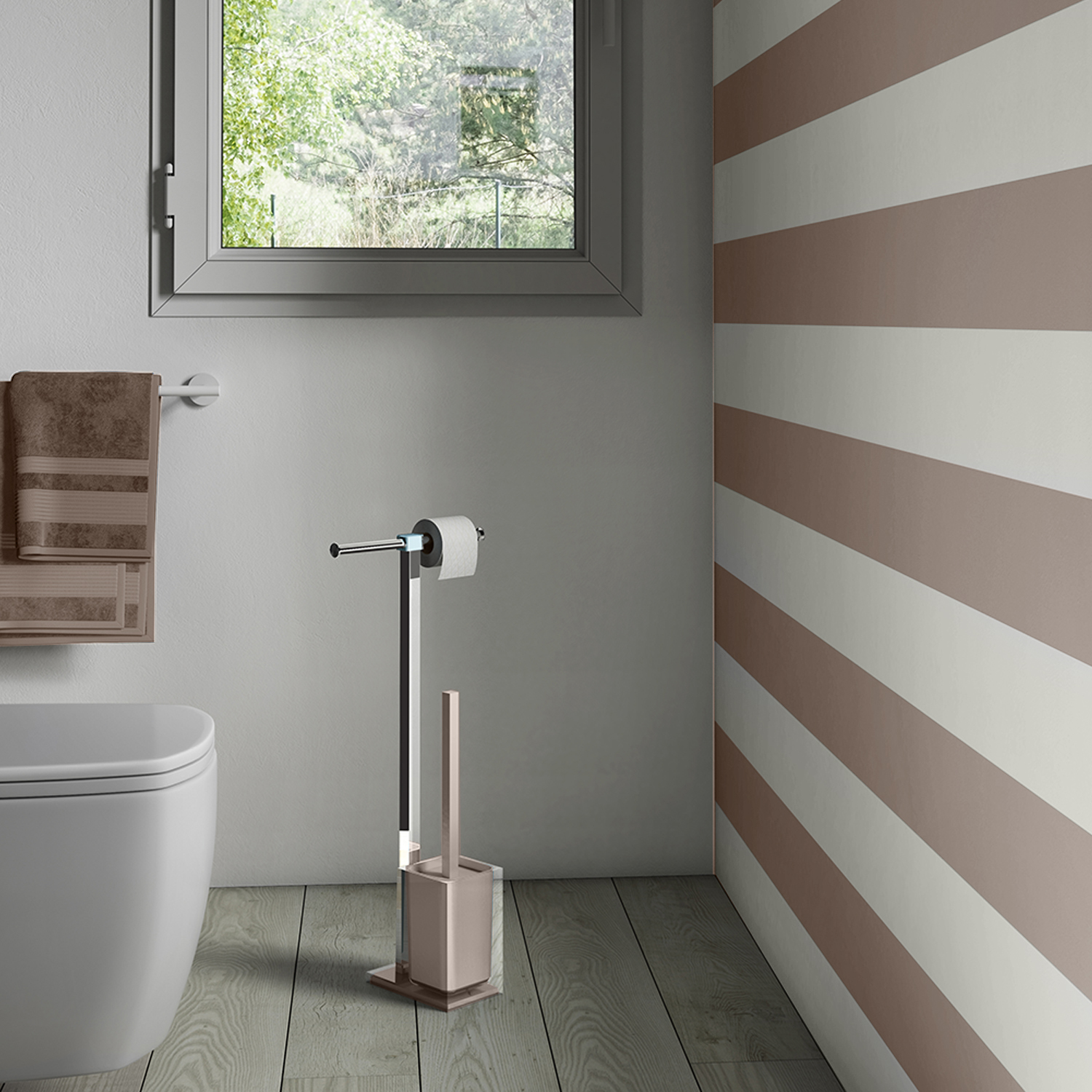 Bathroom butler with toilet paper roll holder and toilet brush holder, with light turtledove grey/transparent coloured base. toilet brush with black bristle brush