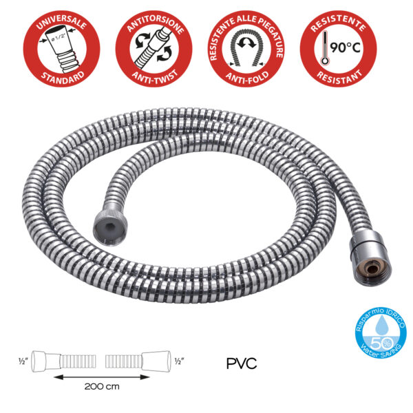 Pvc flexible hose 200 cm 1/2×1/2.plus product: the flexible is anti-twist, resistant to bending and is resistant to a temperature of 90°, has universal attachment and a water saving reduction of 50%.