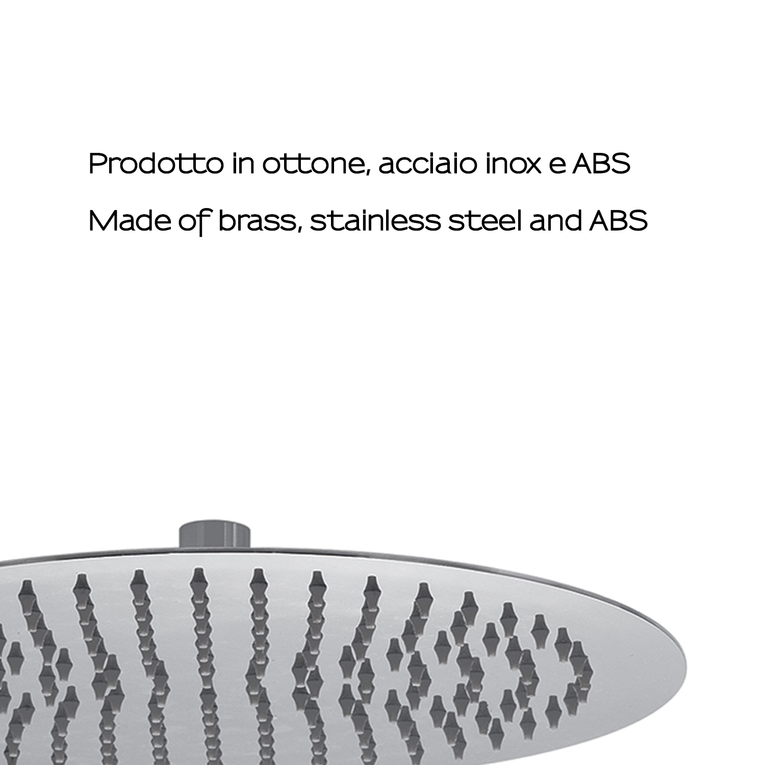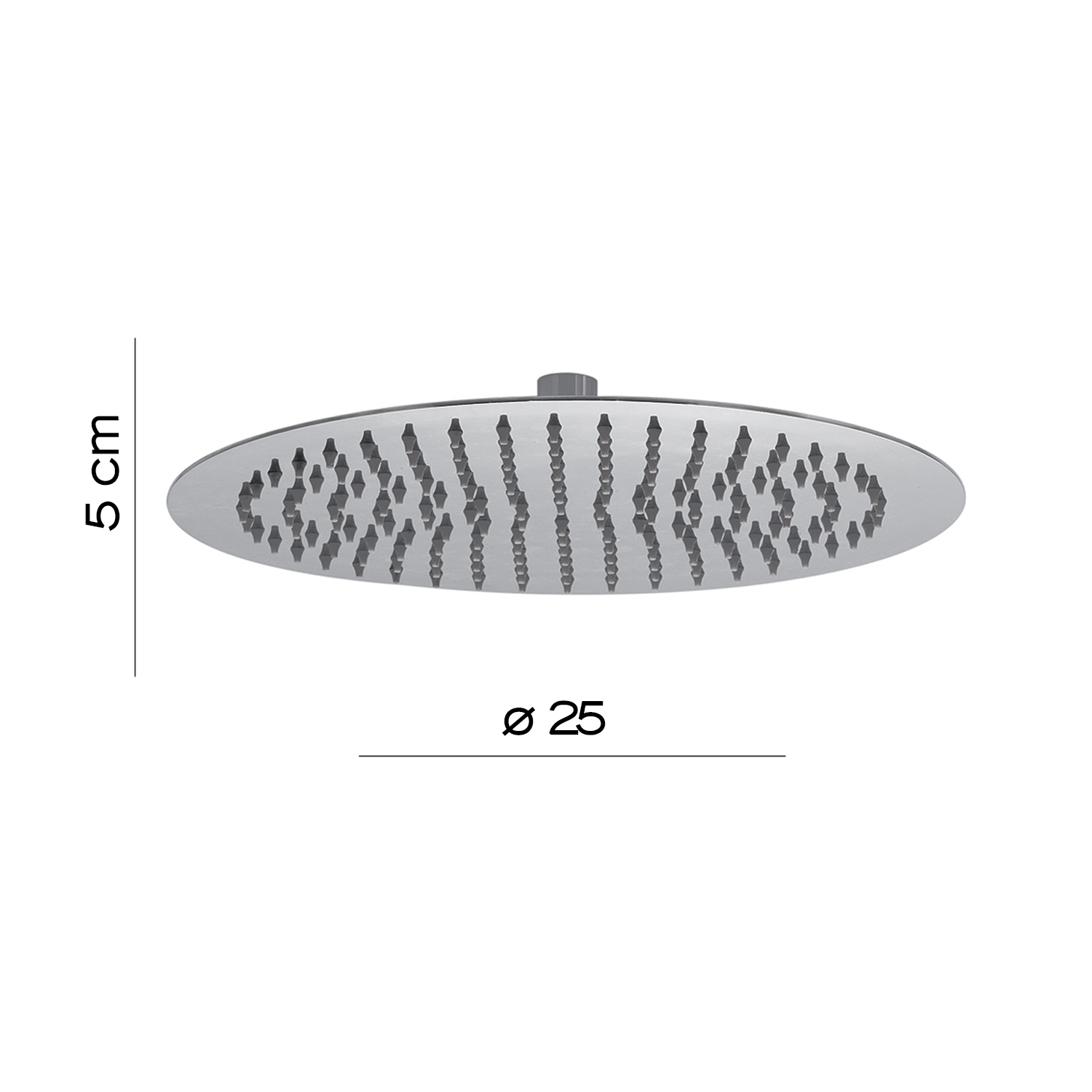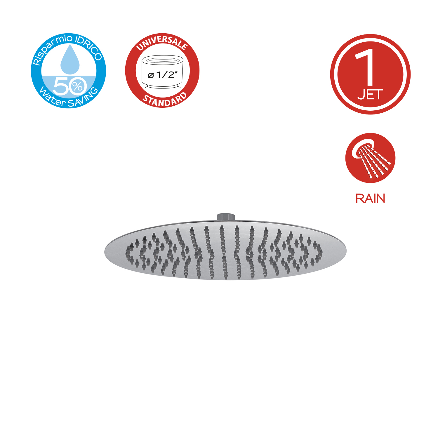 1 jet shower head, ø 25 cm, 1/2 connection. plus product: presence of micro-holes that creates a nebulous effect, universal connection, antisabbia filter and has a water saving reduction of 50%.