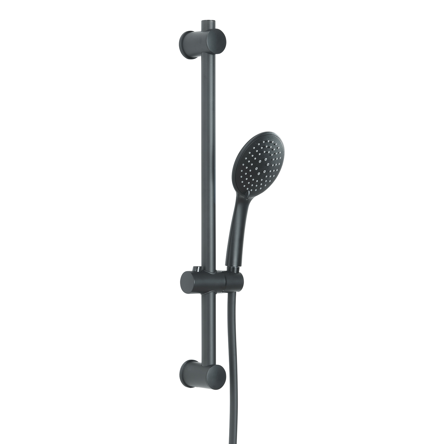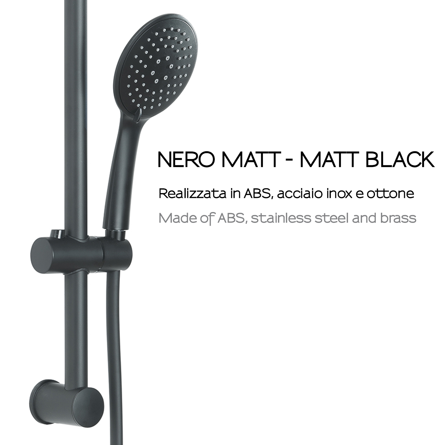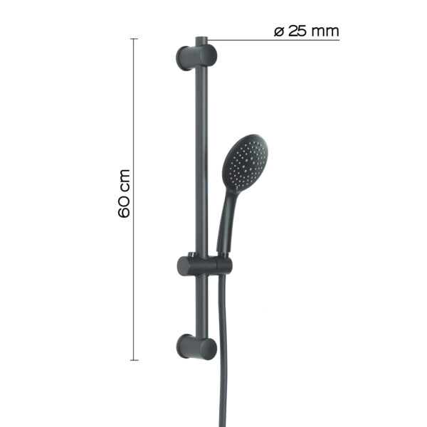 Shower set, 5 jets hand shower, adjustable shower bar 60 cm ø 25 mm, with support, pvc flexible hose 150 cm with conical anti-twist system. plus product: presence of micro-holes that creates a nebulous effect, universal connection, antisabbia filter and has a water saving reduction of 50%. nozzles with easy cleaning system. the hose is tear-resistant, resistant to bending and resistant to a temperature of 90°
