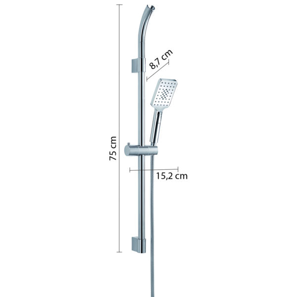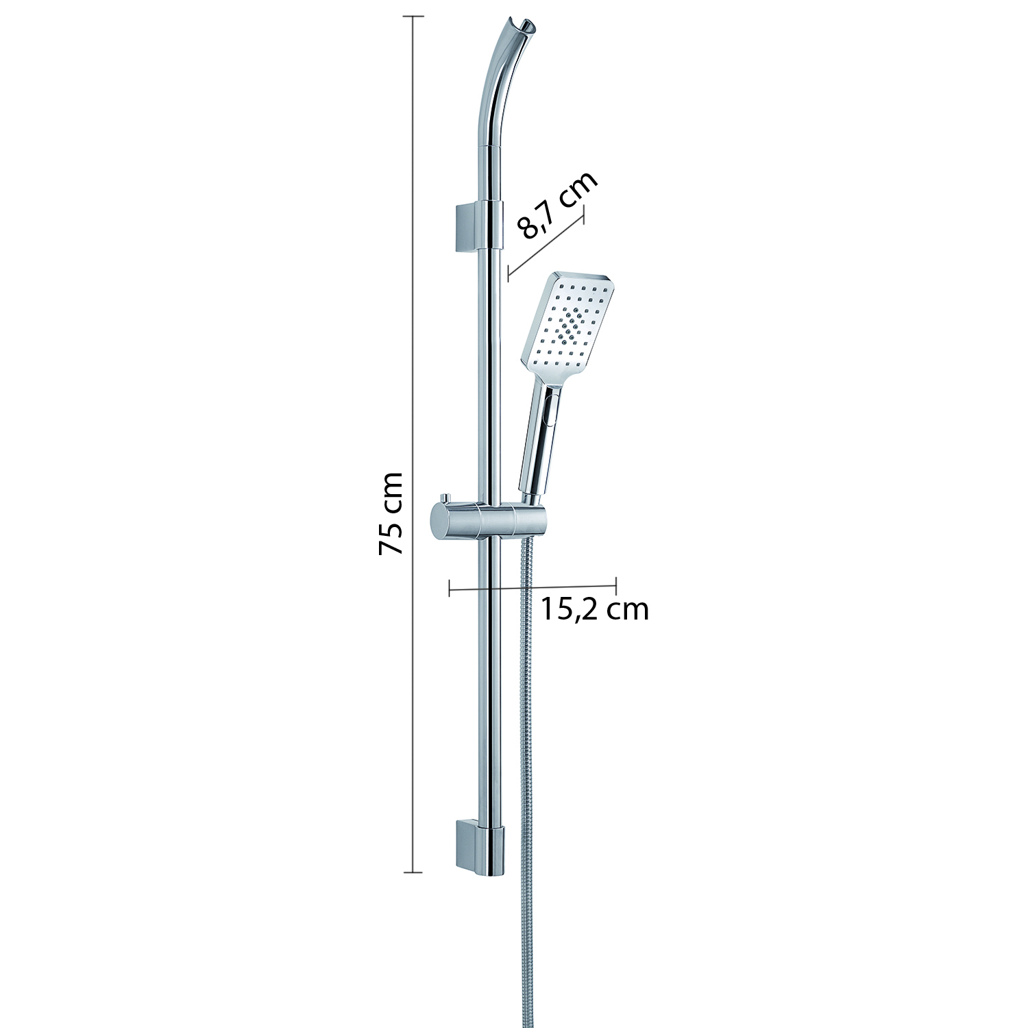 Conjunto de ducha, mango de ducha 3 chorros, barra deslizante regulable de 75 cm ø 25 mm, con soporte superior h 90 cm, flexo en acero inoxidable grapado doble cm 150 /2×1/2 con cono anti torsión. plus producto: presencia de microagujeros que crea un efecto nebuloso, conexión universal, filtro antisha y tiene una reducción en el ahorro de agua del 50%. boquillas con sistema de limpieza fácil. el flexible es resistente a la torsión, resistente a la flexión y es resistente a una temperatura de 90°