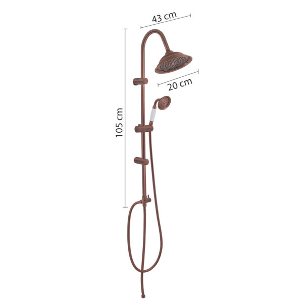 Columna de ducha regulable 104 cm, rociador 1 chorro ø 20 cm, mango de ducha 1 chorro, flexo de acero inoxidable doble grapado 150 cm 1/2×1/2 con sistema cono, flexo de acero inoxidable doble grapado 60 cm 1/2×1/2, cartucho desviador de agua de 2 vías. plus producto: presencia de microagujeros que crea un efecto nebuloso, conexión universal, filtro antisha y tiene una reducción en el ahorro de agua del 50%. boquillas con sistema de limpieza fácil. el flexible es resistente a la torsión, resistente a la flexión y es resistente a una temperatura de 90°