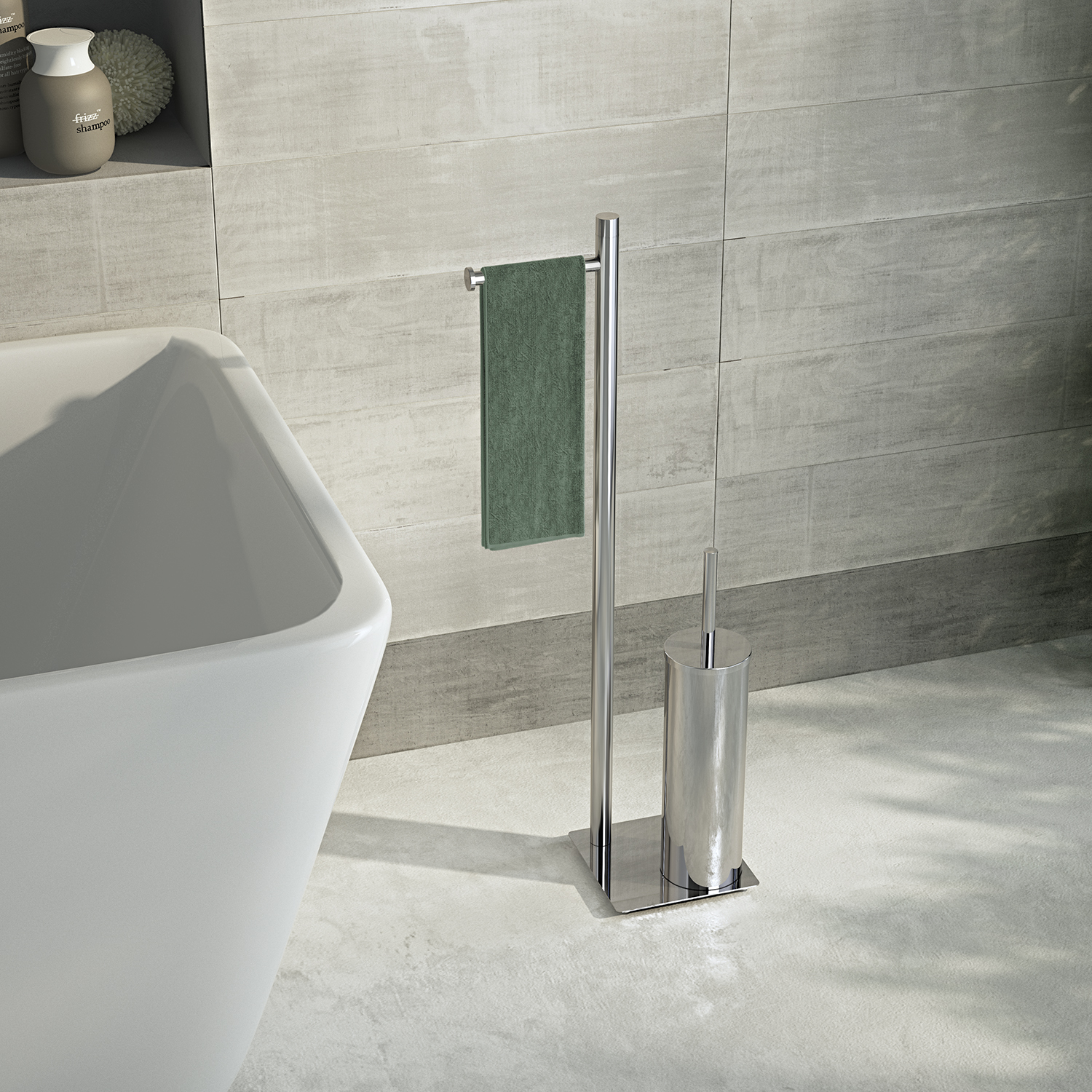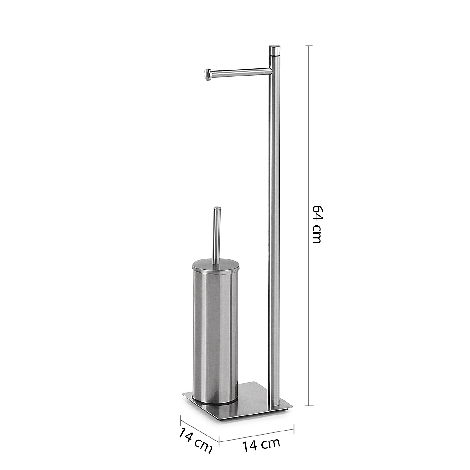 Columna de pie con portarrollos y escobillero y acero inoxidable base. cepillo con puño de cerdas negras y copa interna extraíble apto para fácil limpieza