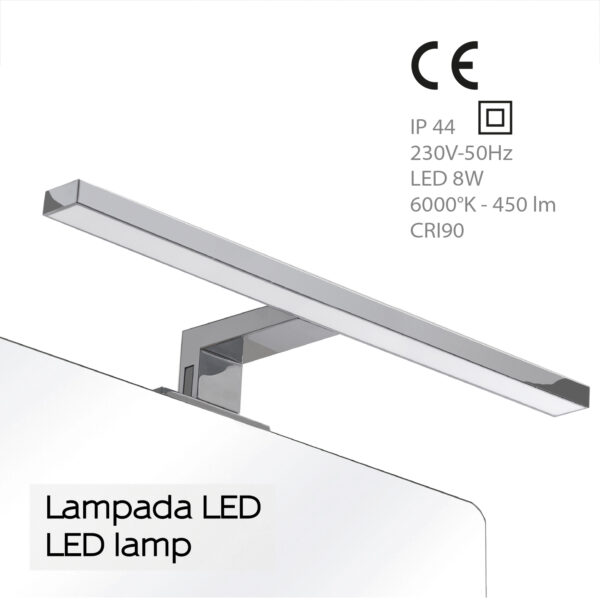 Lampe a leds 45 cm avec fixation universelle pour les miroirs avec et sans cadre. led ip44, ii classe, rohs, classe energetique a group ue874/2012, 8w – 6000°k – cri 90 – 230v- 50hz – 450 lumen.