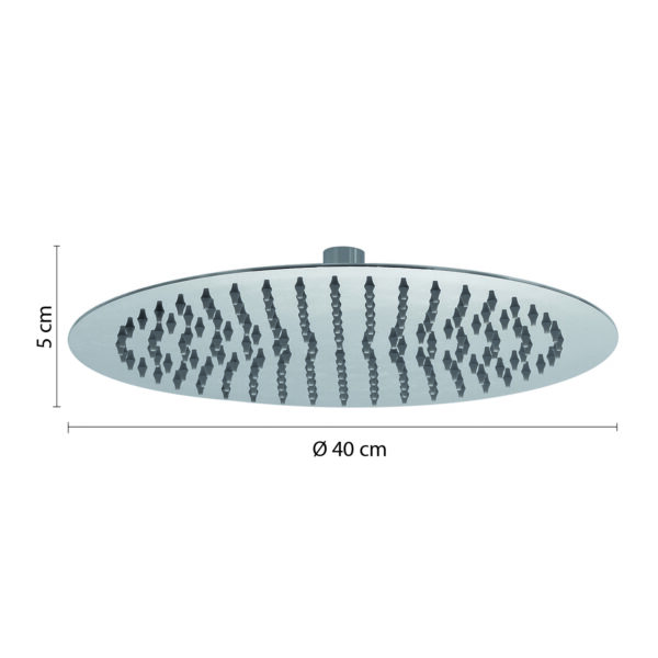Pommeau de douche 1 jet, ø 40 cm, connection de 1/2. plus produit: presence de micropores qui cree un effet nebuleux, attaque universelle, filtre antisha et reduit les economies d’eau de 50%.