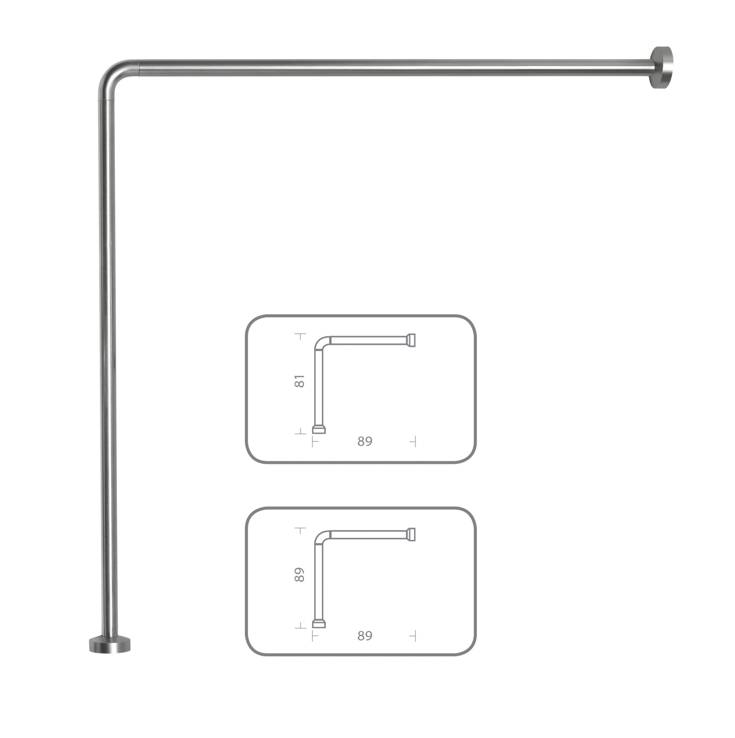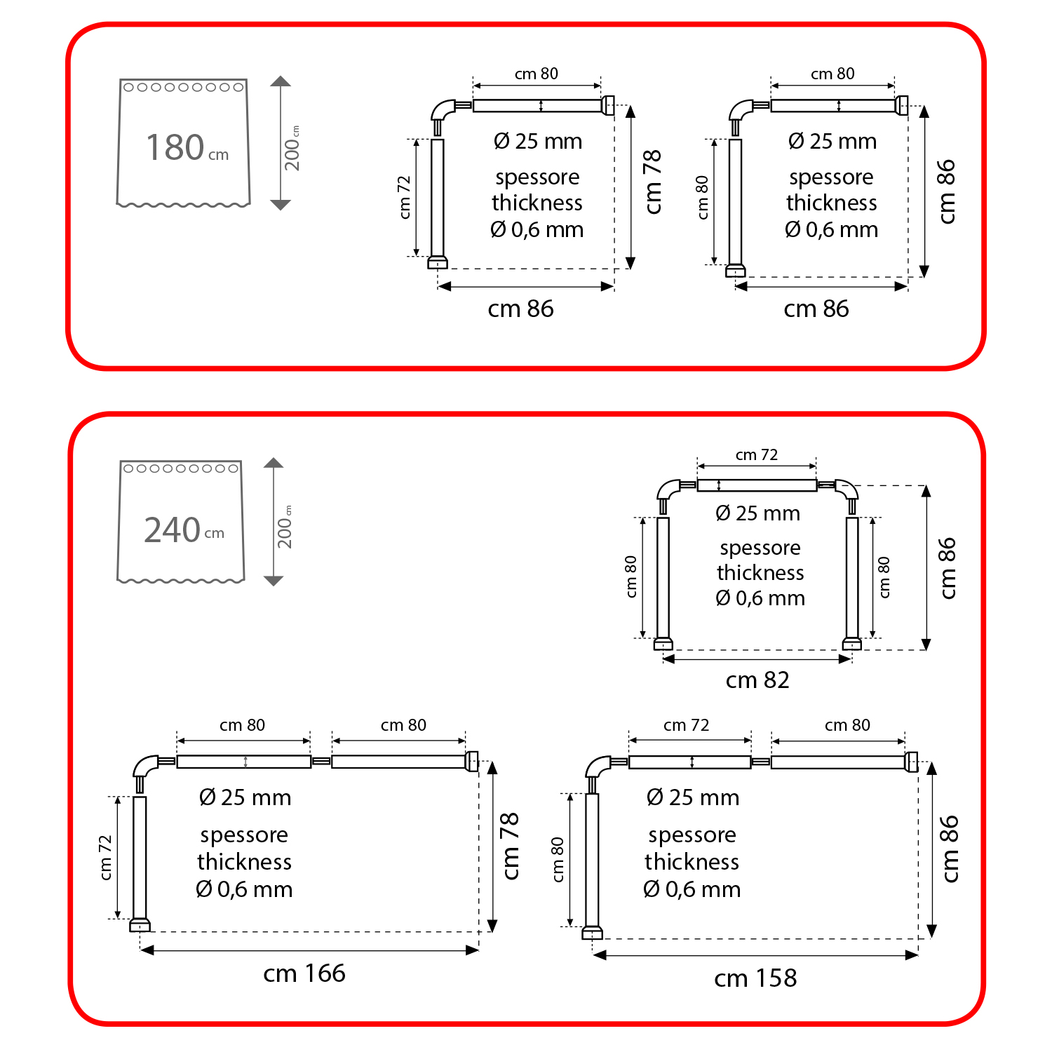Asta angolare universale ø 25 spessore mm 0,6. si consiglia, per l’utilizzo ad angolo, l’uso di tende doccia da 240 cm nel caso in cui la parete lunga misuri di 158 o 166 cm. si consiglia,per l’utilizzo ad angolo, l’uso di tende doccia da 180 cm nel caso in cui la parete lunga misuri 86 cm. si consiglia, per l’utilizzo dei telai che poggiano su una sola parete l’uso di tende doccia da 240 cm