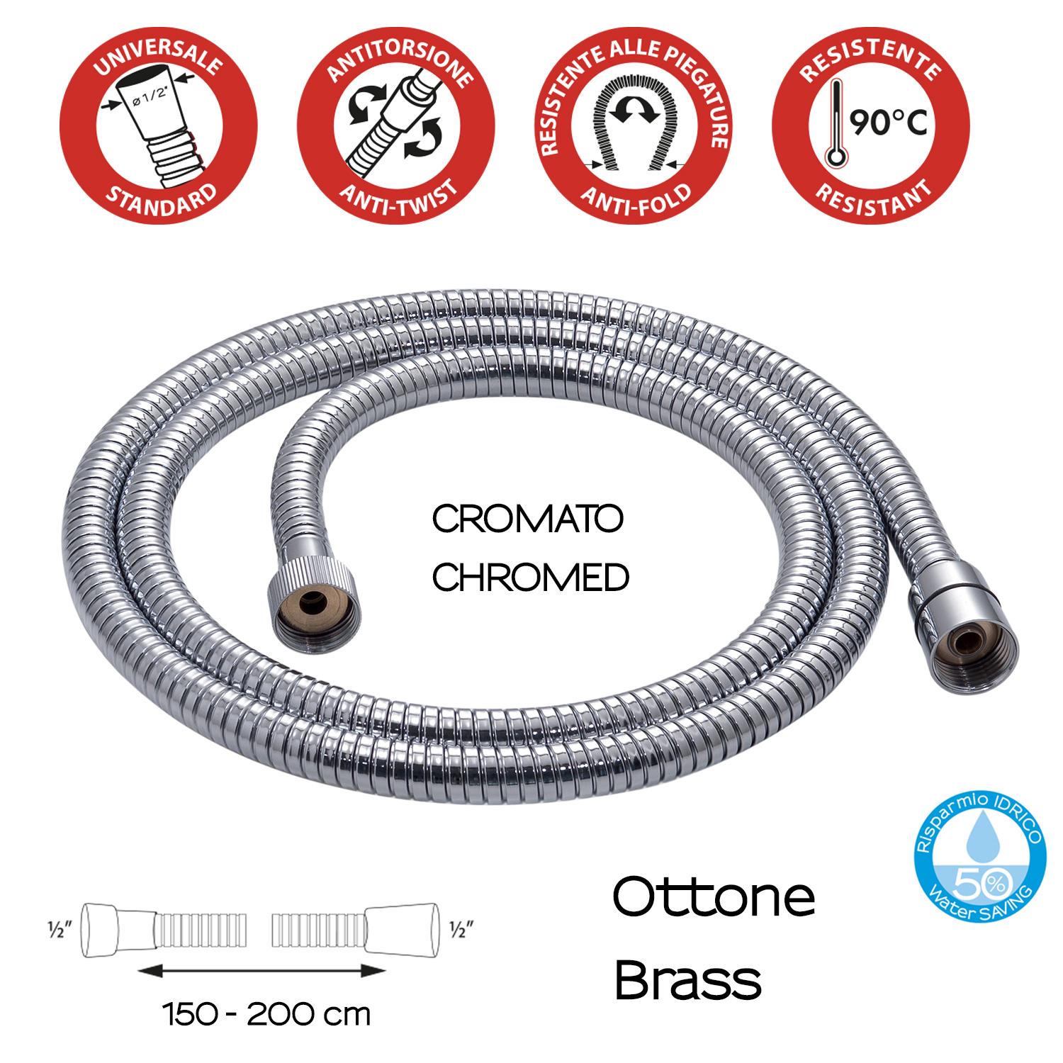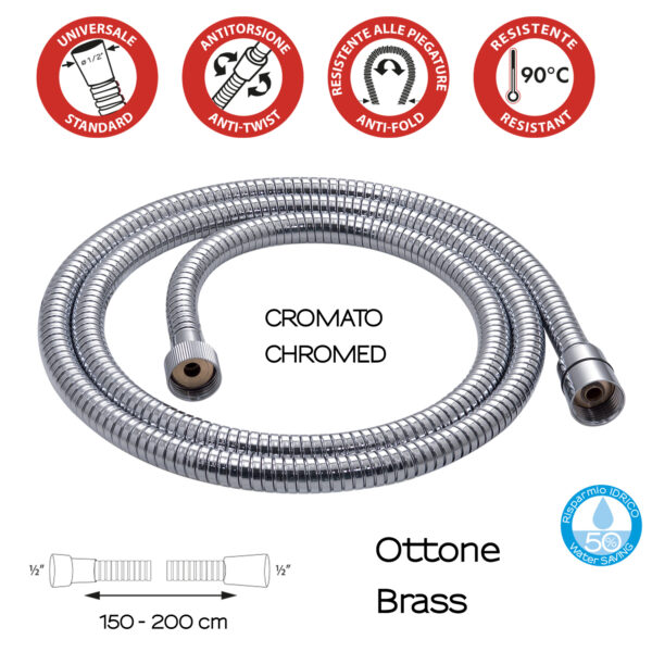 Flessibile in ottone estensibile 150 -200 cm doppia aggraffatura 1/2×1/2 con conico antitorsione ø 14 mm. plus prodotto: il flessibile è antitorsione, resistente alle piegature ed è resistente ad una temperatura di 90°, ha attacco universale e una riduzione di risparmio idrico del 50%.