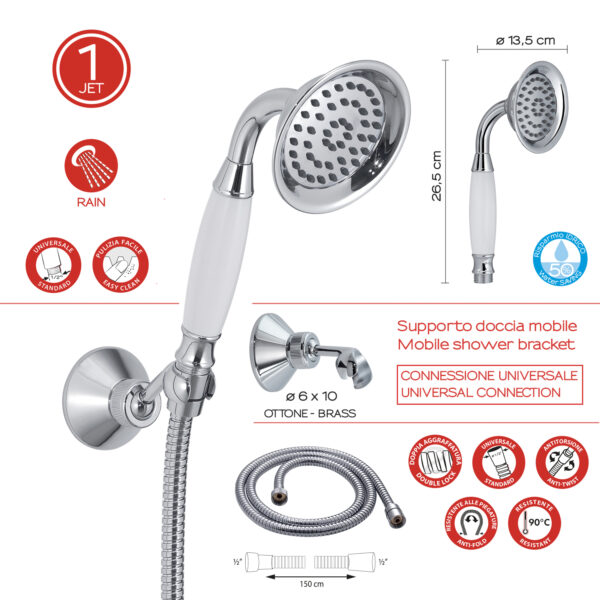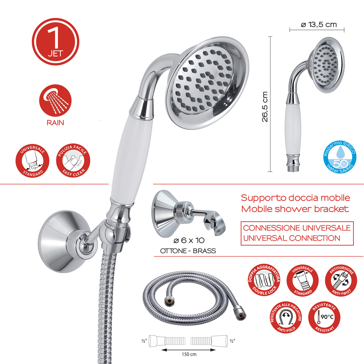 Kit doccia, doccetta 1 getto, supporto mobile, flessibile in acciaio inox cm 150 con doppia aggraffatura 1/2″x1/2″ con conico antitorsione. plus prodotto: presenza di microfori, attacco universale, filtro antisabbia e ha una riduzione di risparmio idrico del 50%. ugelli con sistema di pulizia facile. il flessibile è antitorsione, resistente alle piegature ed è resistente ad una temperatura di 90°