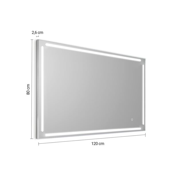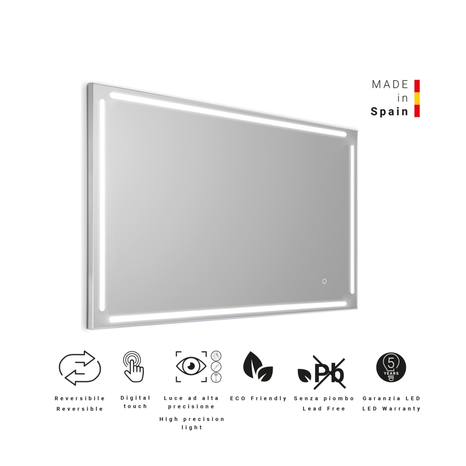 Specchio con luci a led. plus prodotto: accensione touch screen, vetro senza piombo, ecologico e reversibile. questa tipologia di illuminazione e’ idonea a livelli di precisione quali make up e rasatura. i led sono ip44, ii classe, rohs, class exempt group en 62471, 40w – 5700°k – cri>91 – 220-240v – 50-60hz – 900 lumen. questo specchio e’ realizzato in spagna
