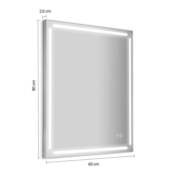 Specchio con luci a led e sistema antiappannamento. plus prodotto: accensione touch screen, vetro senza piombo, ecologico e reversibile. questa tipologia di illuminazione e’ idonea a livelli di precisione quali make up e rasatura. i led sono ip44, ii classe, rohs, class exempt group en 62471, 30w – 5700°k – cri>91 – 220-240v – 50-60hz – 740 lumen. potenza anti fog 22w. questo specchio e’ realizzato in spagna