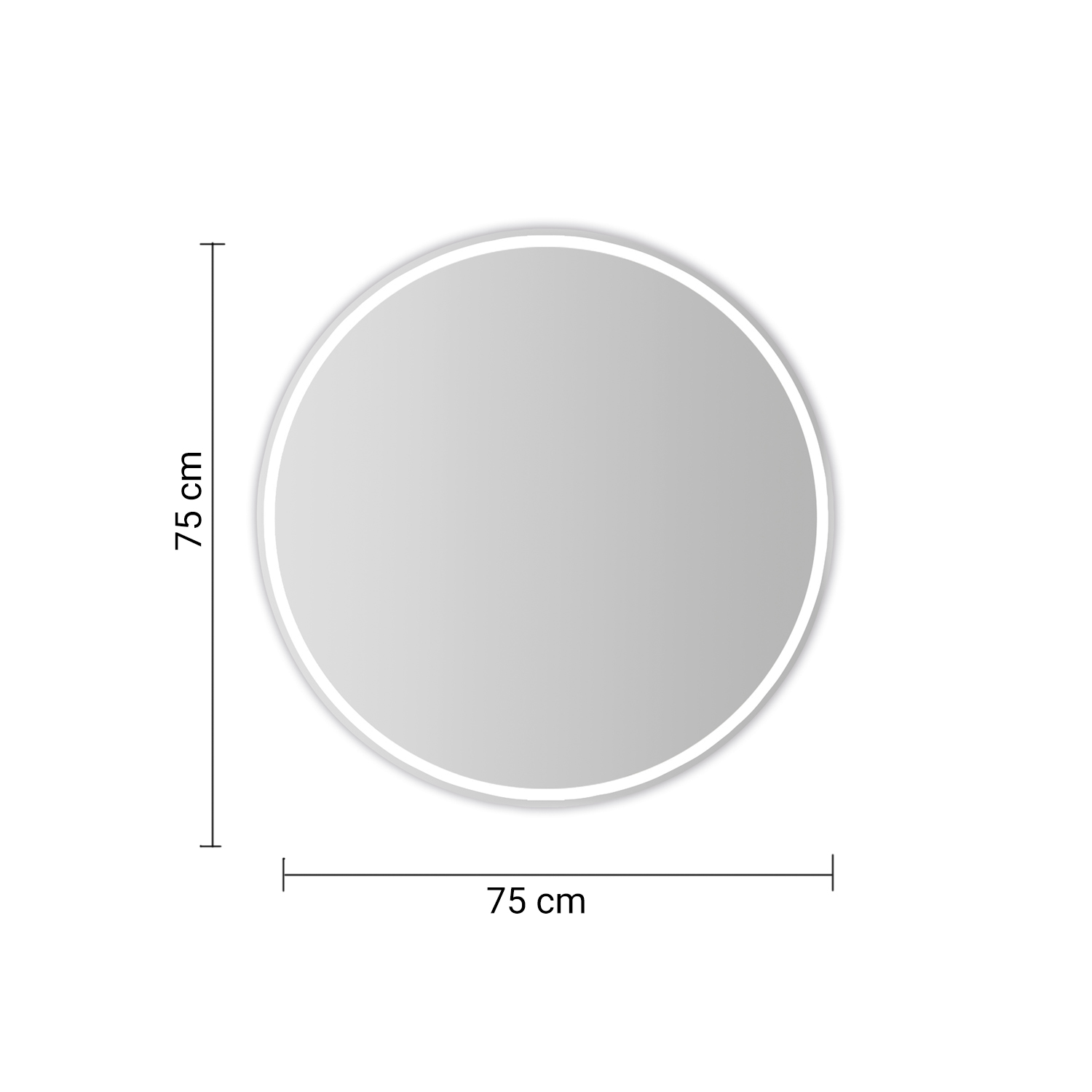 Specchio filo lucido diametro 75 cm con luci a led. plus prodotto: sistema antiappannamento, vetro senza piombo e ecologico. i led sono ip44, ii classe, rohs, class exempt group en 62471, 20w – 5700°k – cri>83 – 220-240v – 50-60hz – 1140 lumen. potenza ant fog 22w. questo specchio e’ realizzato in spagna