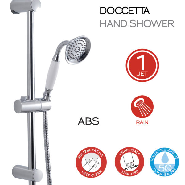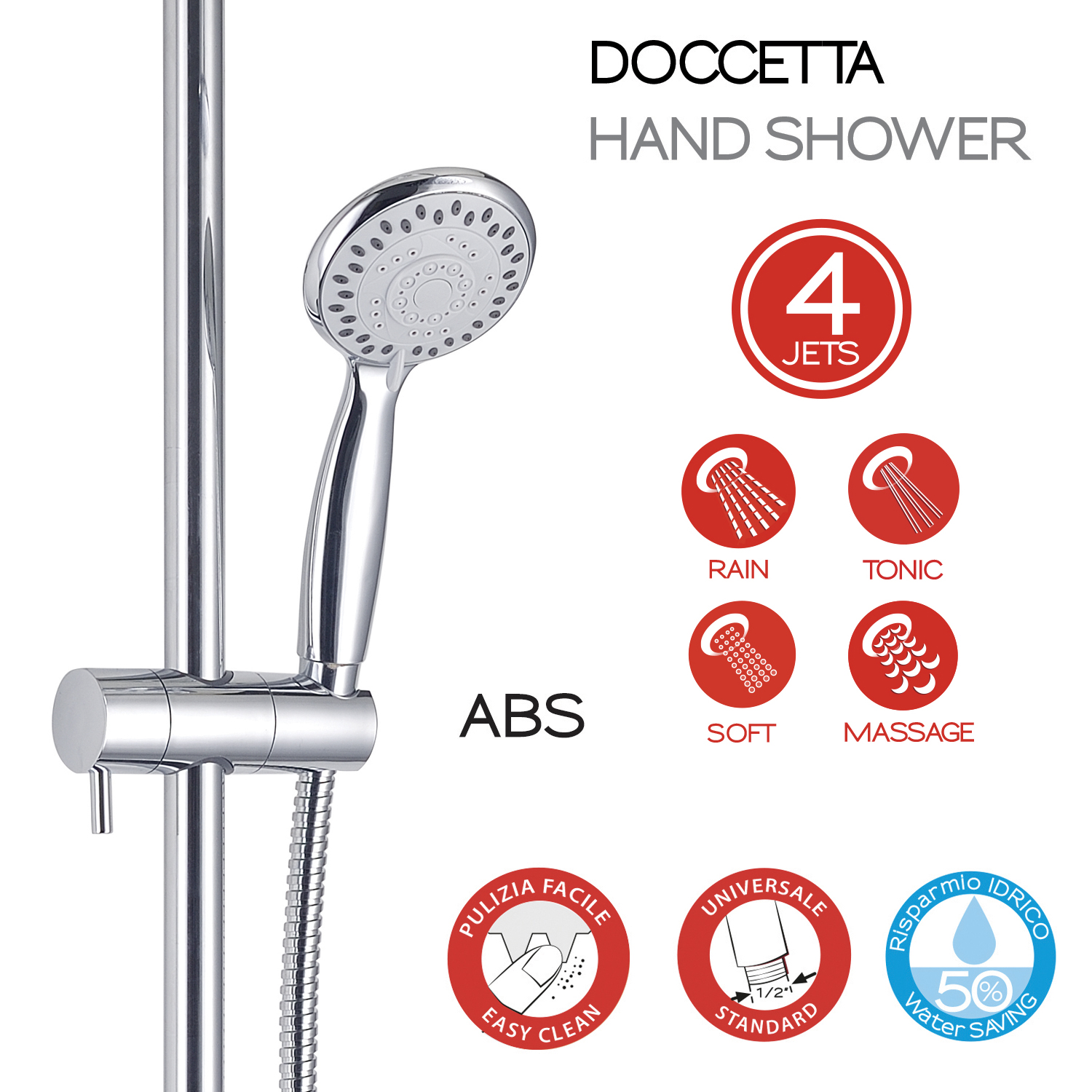 Colonna doccia estensibile 80-140 cm, miscelatore manuale, soffione 1 getto ø 22,5 cm, doccetta a 4 getti, flessibile acciaio inox 150 cm doppia aggraffatura 1/2×1/2 con conico antitorsione. plus prodotto: presenza di microfori che crea un effetto nebuloso, attacco universale, filtro antisabbia e ha una riduzione di risparmio idrico del 50%. ugelli con sistema di pulizia facile. il flessibile è antitorsione, resistente alle piegature ed è resistente ad una temperatura di 90°