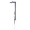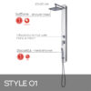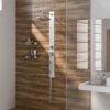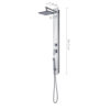 Pannello doccia in vetro temperato 130x11x48 cm, soffione 1 getto 20×20 cm, doccetta 1 getto, miscelatore manuale, deviatore acqua a 2 vie, flessibile acciaio inox cm 150 doppia aggraffatura 1/2×1/2 con conico antitorsione. plus prodotto: presenza di microfori che crea un effetto nebuloso, attacco universale, filtro antisabbia e ha una riduzione di risparmio idrico del 50%. ugelli con sistema di pulizia facile. il flessibile è antitorsione, resistente alle piegature ed è resistente ad una temperatura di 90°