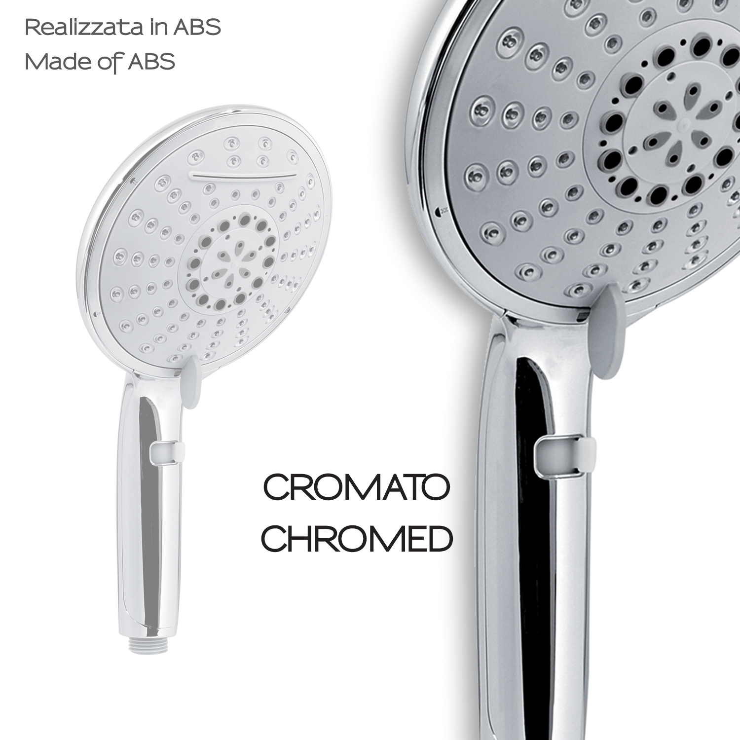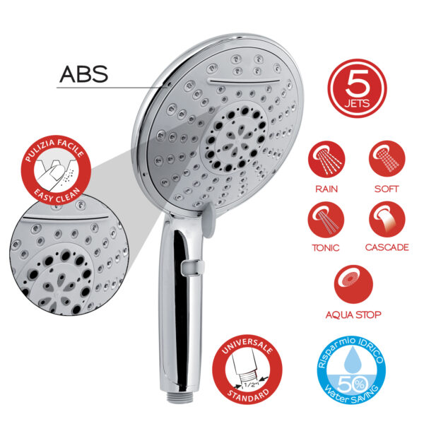 Doccetta a 4 getti, effetto rain, tonic, soft e cascade. attacco misura universale standard. plus prodotto: dotato di pulsante acqua stop, filtro antisabbia e tettarelle che permettono una facile rimozione del calcare accumulatosi e di un filtro che permette la riduzione fino al 50% del consumo d acqua. ugelli con sistema di pulizia facile.