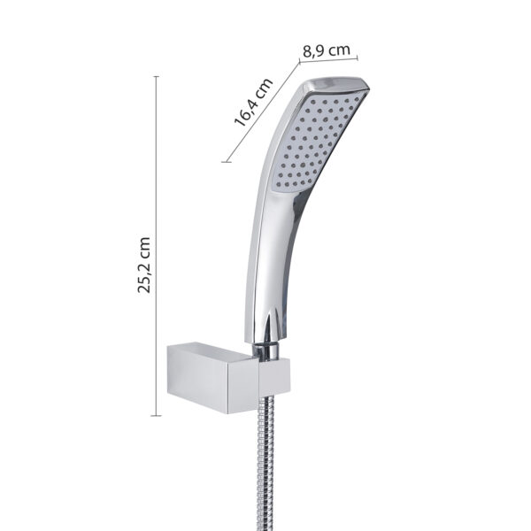 Kit doccia, doccetta 1 getto, supporto mobile, flessibile in acciaio inox cm 150 con doppia aggraffatura 1/2×1/2 con conico antitorsione. plus prodotto: presenza di microfori, attacco universale, filtro antisabbia e ha una riduzione di risparmio idrico del 50%. ugelli con sistema di pulizia facile. il flessibile è antitorsione, resistente alle piegature ed è resistente ad una temperatura di 90°